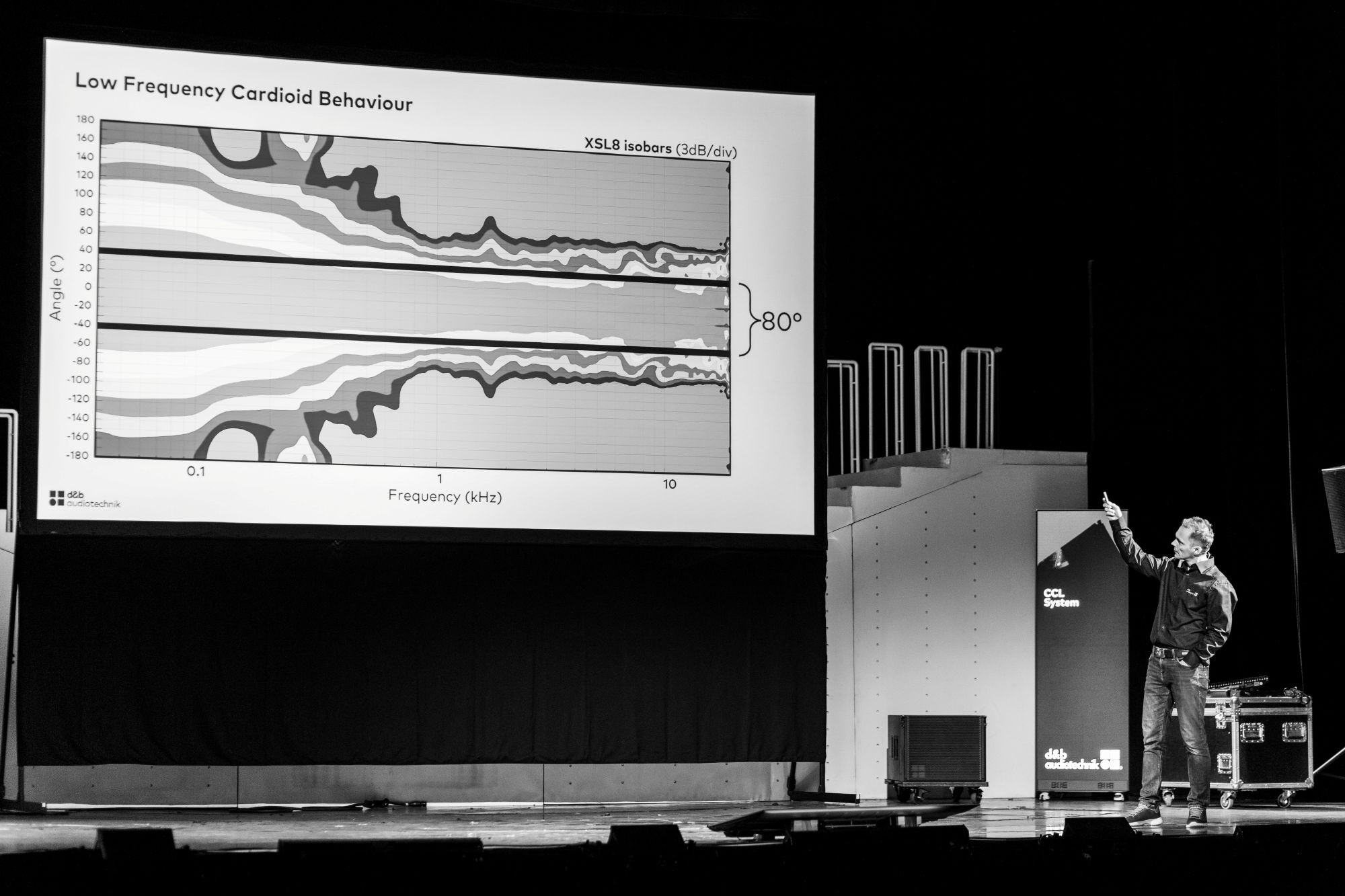 A rendezvény időrendjét tekintve Midas (Alexei Korolev), a d&b audiotechnik előadója felvázolta a CCL rendszer pozícióját a termékportfólióban, kiemelve annak előnyeit és alkalmasságát a zárt, koncert jellegű helyszínek esetén. Ezután a közönség bevonásával a színpadon tesztelte a kardioid lesugárzást, rábízva ennek ellenőrzését vendégeink fülére. Az interaktív rész után következett az, amire mindenki várt, szakaszosan felépítve, először szub nélkül, majd a teljes install-t kihasználva, megszólaltak az eszközök. A látogatók elégedett bólogatása jelezte, hogy mindenki azt kapta, amire számított, a gyártó ismét egy kiváló hangú, részletes és dinamikus hangzású rendszerrel lépett ki a piacra, amit tekinthetünk a d&b audiotechnik legfontosabb védjegyeinek is.