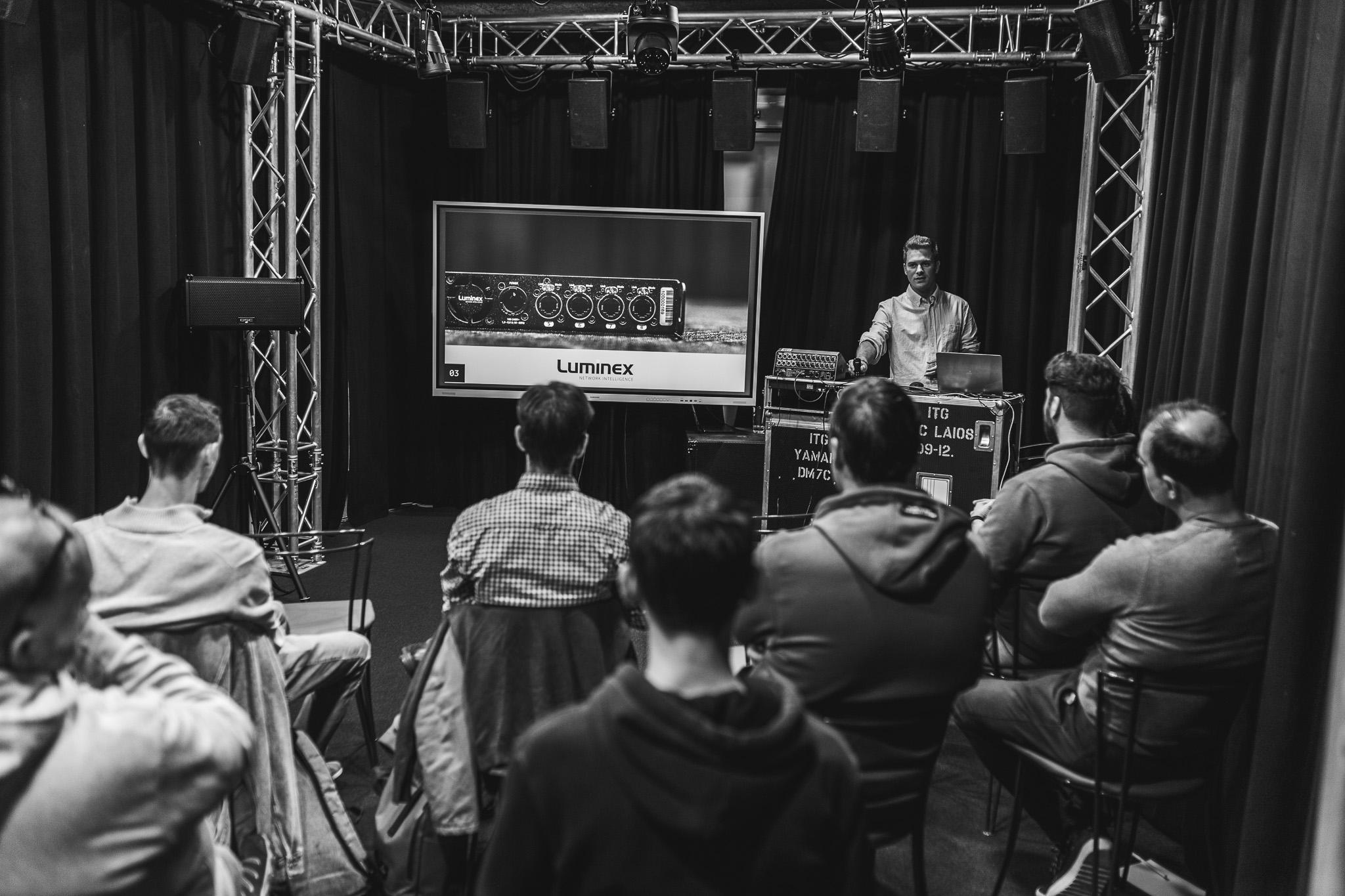 A tegnapi napon, vagyis október 9-én le is zajlott az első etap, melyen egymásra épülő modulokban lehetett felszedni az IP hangátvitel alapjait, kezdve a formátum történetével, ökölszabályaival és topológiájával. Ádám egy jól vezetett prezentációban adta tovább a tudást, mely abszolút piacképes a modern hangosításban és a képzés végén gyakorlati példákkal is szemléltette annak minden előnyét. Ebben a részben az Interton Group saját disztribúciójából válogatott professzionális termékei voltak segítségére, mint a Yamaha DM pultjai (DM3 és DM7), valamint a Luminex switchek és a QSC új L-Class aktív line-array rendszere.