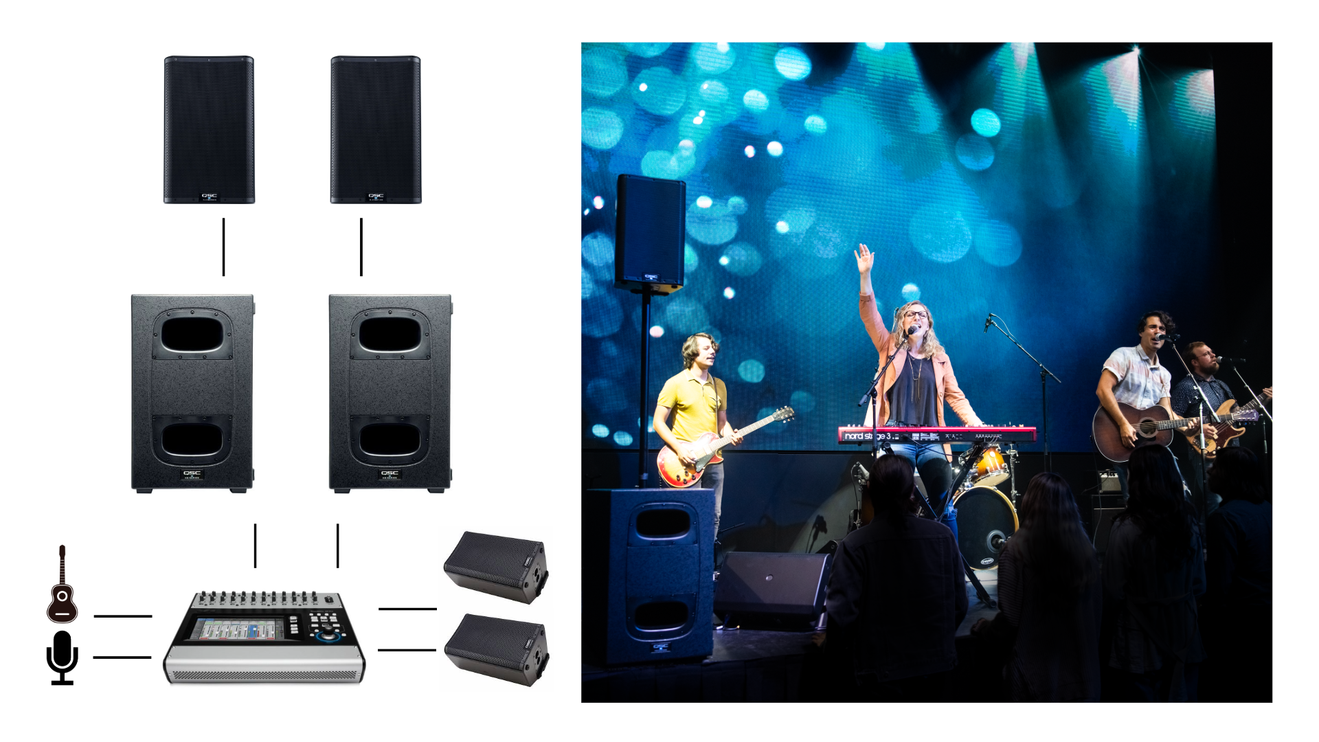Nincs is jobb dolog annál, mint amikor együtt játszotok a közönségnek, sajnos mégis van ami el tudja rontani az élményt. Mindig törekedjetek arra, hogy a megfelelő eszközökön szólaljon meg a produkciótok, hiszen hiába a sok gyakorlás és a színpadi rutin, ha a hallgatóság nem érti mit szeretnétek kifejezni! Az alábbi ábrán egy klasszikus setup kapott helyet, amivel nem fogtok családást okozni, magatoknak sem!