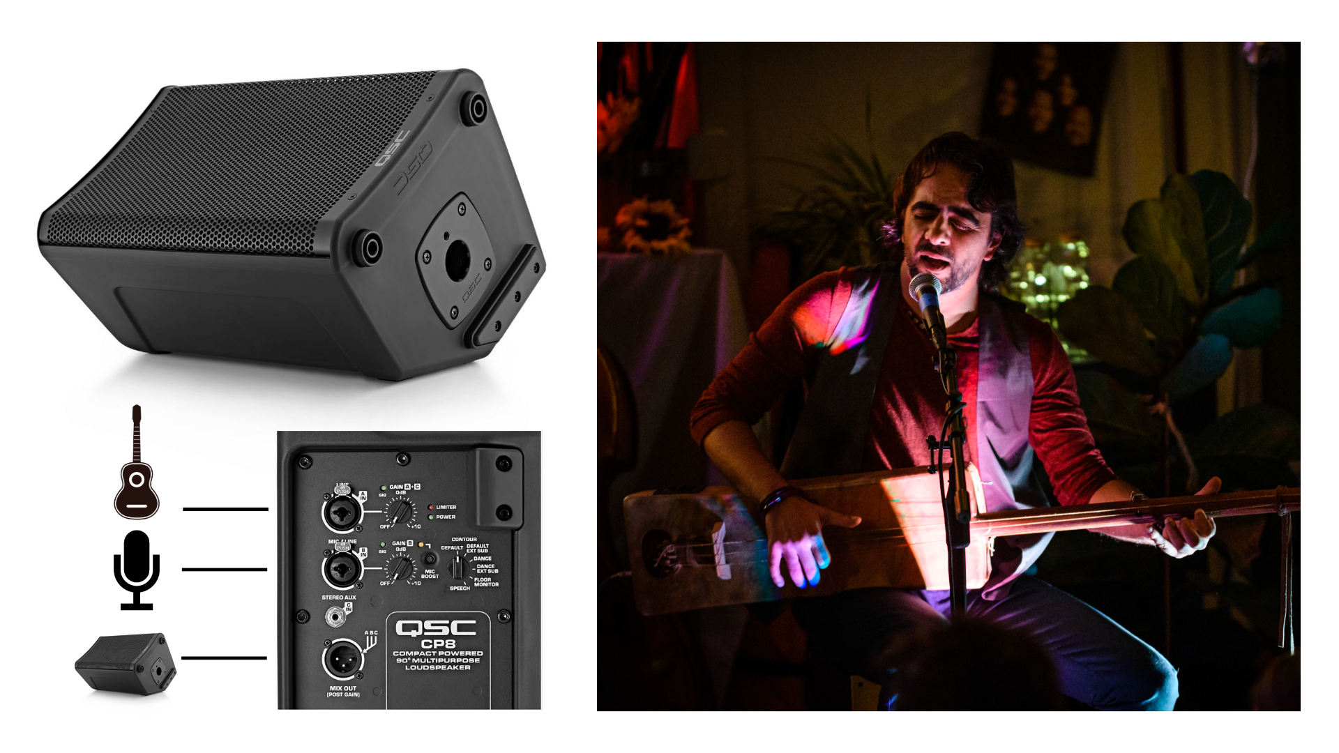 Az alábbi ábrán jól értelmezhető, hogy nem feltétlenül van szükséged keverőre egy kis kávéházas fellépéshez, hiszen a gitárt és a mikrofont könnyen összegezheted a QSC CP8-as bemenetein is és a jelet tovább is tudod küldeni egy másik CP8-as hangsugárzóba!